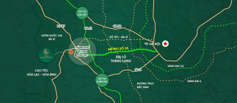 Về giao thông, Hanoi Tropical Garden hưởng lợi từ hệ thống hạ tầng hiện đại. Cách Quốc lộ 21 chỉ 500 m, Đại lộ Thăng Long 5 km, Quốc lộ 6 10 km, sân bay Nội Bài khoảng 50 phút lái xe. Cầu Tứ Liên dự kiến hoàn thành 2027 sẽ giảm thời gian đến trung tâm Hà Nội xuống 30 phút. Các tuyến đường lớn như Yên Bình – Thạch Thất giúp tránh ùn tắc, kết nối nhanh với Hòa Lạc High-Tech Park (5 phút) và National Convention Center (40 phút). Dự án còn trên trục kinh tế – chính trị, gần Samsung R&D (20 phút) và các khu đô thị như Xanh Villas liền kề.